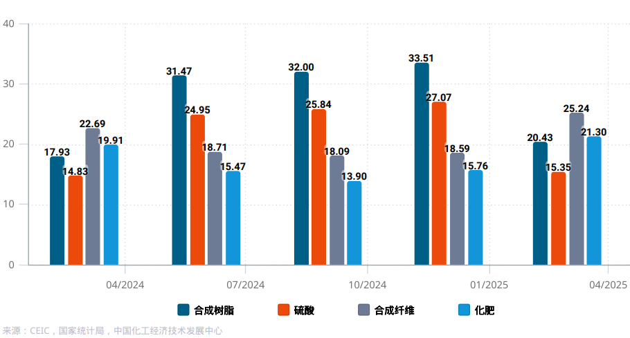 2025年第一季度,中国化工行业延续增长态势,工业增加值同比增长8.8%。下游需求增强为行业提供支撑,特别是汽车行业带动合成橡胶、合成树脂产量分别同比增长9.7%和13.8%。硫酸、烧碱等基础化学品生产呈现强劲增长。同时,农用化学品受益于季节性需求提升,化肥与农药产量分别同比增长7%和10.1%。